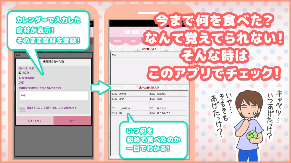 ・初めて食べた食材がカレンダー上で赤く表示されます。