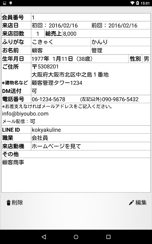 初回来店日、前回来店日、名前、誕生日、電話番号、メールアドレス、来店動機、職業、その他メモを管理