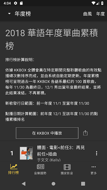 KKBOX 風雲榜為華人世界最具公信力的音樂排行榜,依據 KKBOX 全體會員在特定期間完整聆聽歌曲的有效點播總次數排序而成。