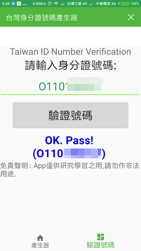 本app提供身份證號碼驗證功能,輸入後可檢驗是否是正確的.