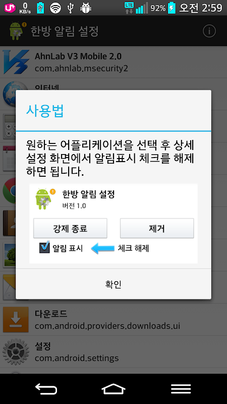 한방 알림 설정은 각종 앱에서 띄우는 귀찮은 알림들을 손쉽게 끌 수 있는 앱입니다.