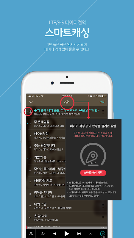 1번 들은 곡은 임시 저장되어 데이터 걱정 없이 들을 수 있습니다.