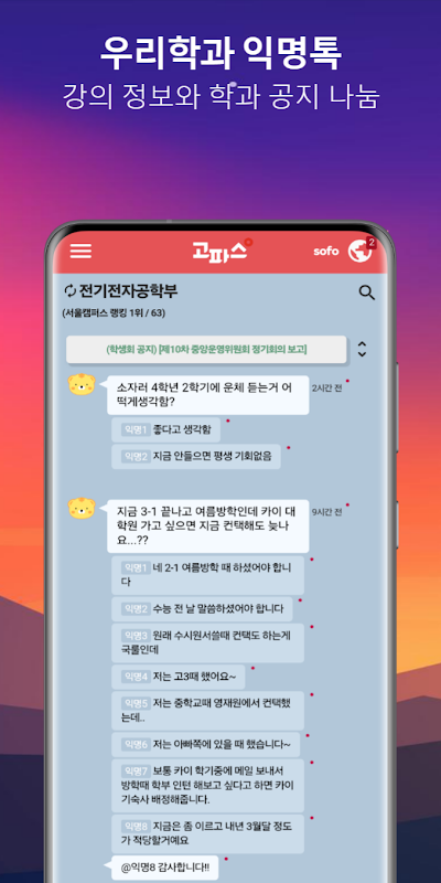 कोरिया विश्वविद्यालय समुदाय गोपास आधिकारिक ऐप! यह समुदाय, रोजगार की जानकारी, विभाग द्वारा बात, वाचनालय, शैक्षणिक शिक्षा और व्याख्यान मूल्यांकन कार्यों से सुसज्जित है।