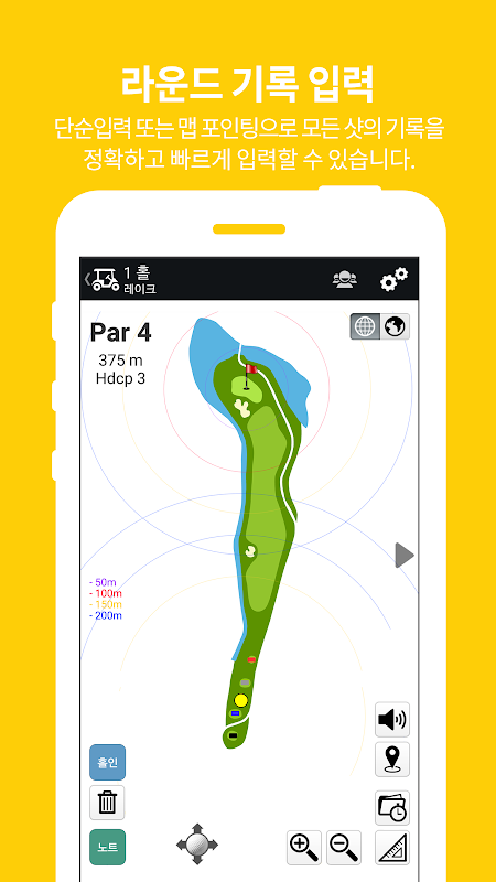 - 휴대폰 GPS기능을 켜보세요! 라운딩 중 자신의 정확한 위치를 바로 알 수 있어 더욱더 정밀하게 그린까지의 거리, 벙커와 해저드의 위치까지 확인하며 간편하게 기록이 가능합니다.