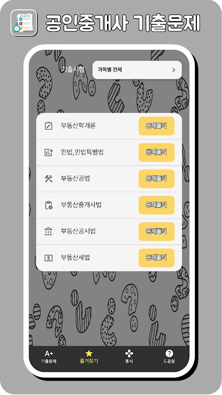 - आप सत्र और विषय के अनुसार पसंदीदा के रूप में पंजीकृत रियल एस्टेट एजेंट परीक्षा प्रश्नों को फिर से हल कर सकते हैं।
