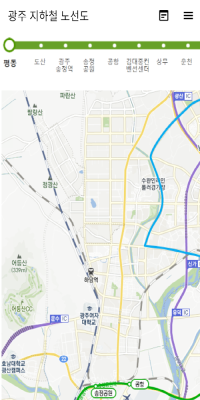ग्वांगजू सबवे मार्ग मानचित्र का नवीनतम संस्करण, जिसे आसानी से देखने के लिए सुधार किया गया है।