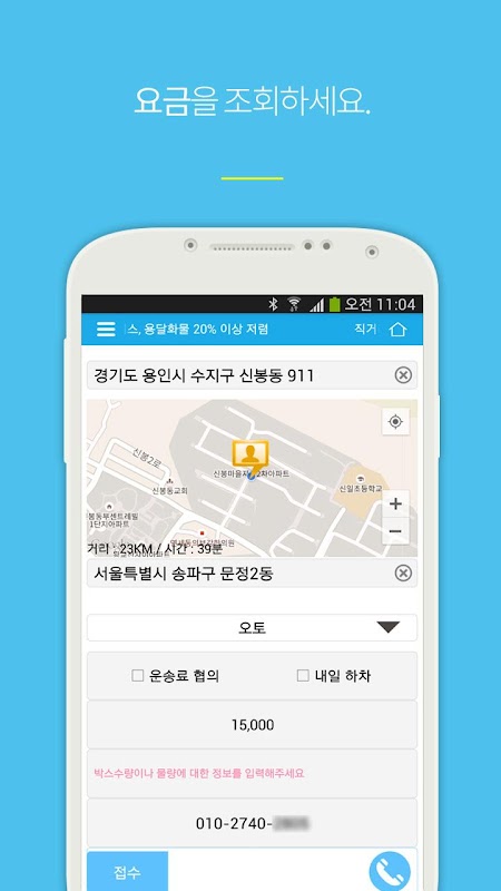 목적지를 입력하면 요금 및 예상 도착 시간을 제시합니다.