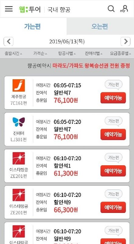 대한항공, 아시아나, 진에어, 제주항공, 이스타항공, 티웨이항공, 에어부산, 에어서울 실시간 예약