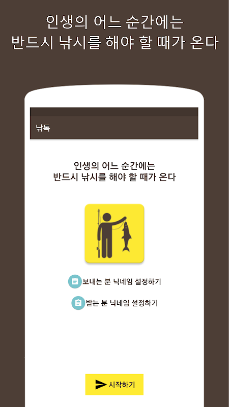 낚톡은 가벼운 장난을 치기 위하여 만들어졌습니다. 이 외의 용도로 사용 시, 제3자와 분쟁이 발생할 경우 낚톡은 일체의 책임을 지지 않으며, 이로 인하여 일어나는 모든 책임은 사용자에게 있습니다.