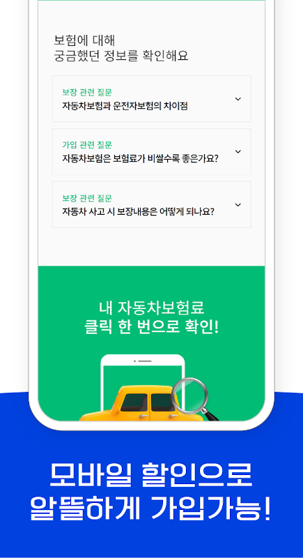 आप सार्वजनिक प्रमाण पत्र जैसी बोझिल प्रमाणीकरण प्रक्रियाओं के बिना केवल जानकारी दर्ज करके ऐप का उपयोग कर सकते हैं। एक क्लिक के साथ रीयल-टाइम बीमा प्रीमियम गणना, बीमा कंपनी द्वारा तुलनात्मक उद्धरण प्राप्त करें, और विभिन्न विशेष अनुबंध लाभों पर जानकारी प्राप्त करें।