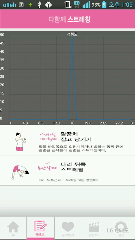 다함께 스트레칭의 가장 큰 목적은 스트레칭의 생활화 입니다. 내정보의 달력을 터치하면 자신이 할
