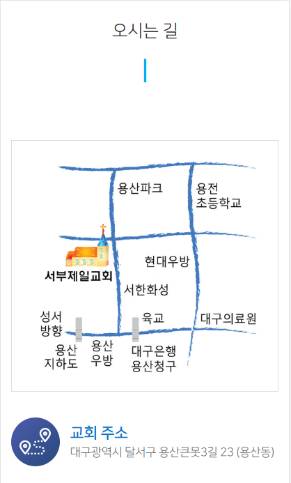 대구광역시 달서구 용산큰못3길 23에 있는 서부제일교회 홈페이지입니다.