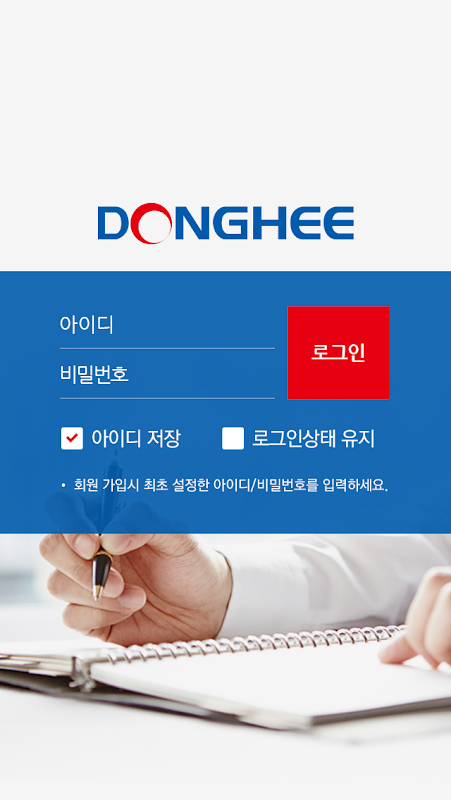 PC환경의 동희그룹 연수원(http://donghee.hunet.co.kr)의 아이디와 비밀번호로 로그인 가능하며, 주요 서비스를 본 모바일 앱에서도 사용하실 수 있습니다.