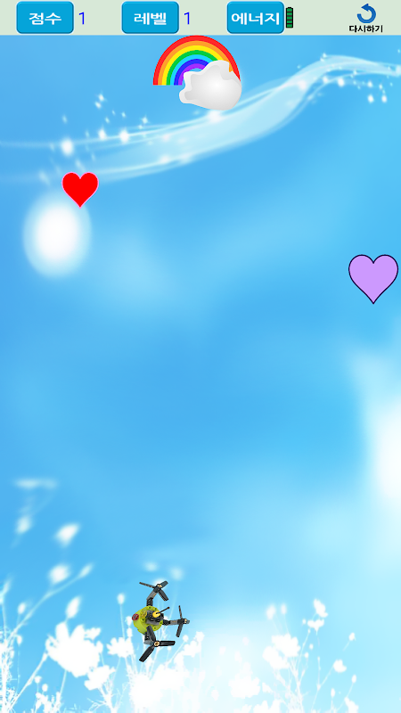 드론이 빨간 하트에 닿으면 진동이 울리며 점수가 올라가고, 보라색 하트에 닿으면 소리가 나면서 점수가 내려간다.