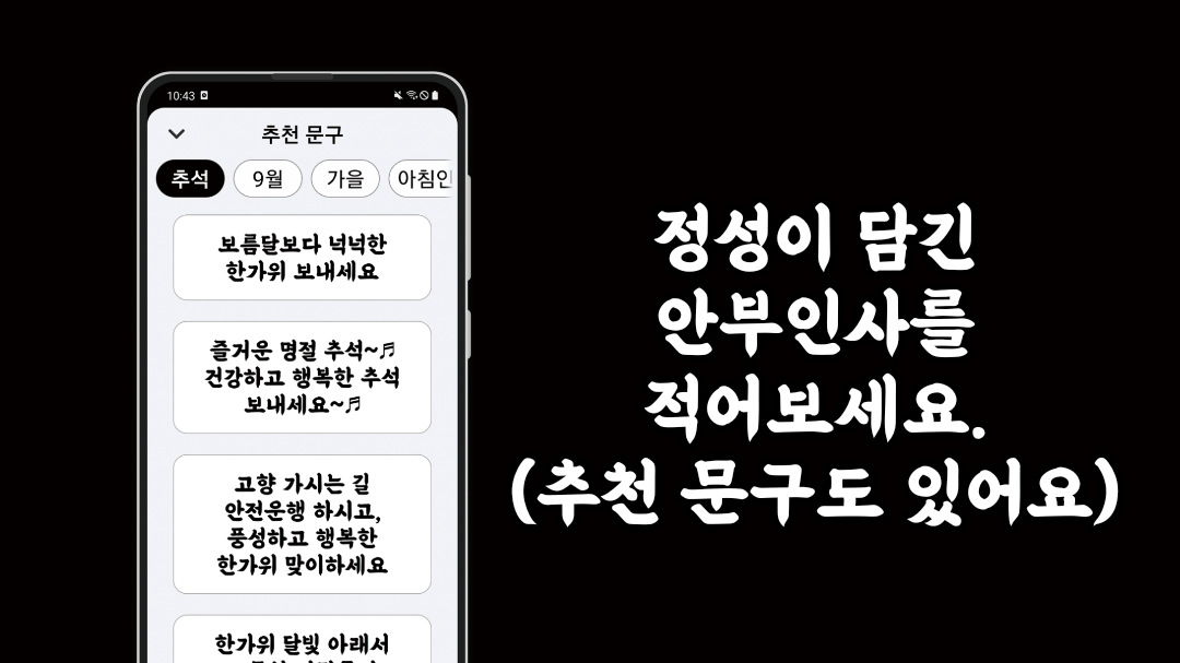 • चुसेओक शुभकामनाएँ, चुसेओक वाक्यांश, चंद्र नव वर्ष की शुभकामनाएँ, नए साल की शुभकामनाएँ, और यहाँ तक कि क्रिसमस कार्ड भी! • आसानी से जन्मदिन, सप्ताह के दिन और मौसमी शुभकामनाएँ बनाएँ।