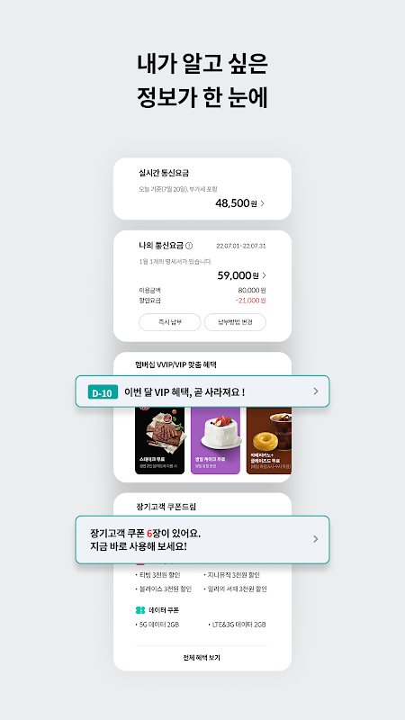 सदस्यता उपयोग की स्थिति और अनुकूलित लाभों के अलावा, आप विभिन्न लाभ संबंधी जानकारी जैसे दीर्घकालिक ग्राहक कूपन सपने और प्रत्येक ग्राहक के लिए उपलब्ध ओटीटी सदस्यता छूट की तुरंत जांच और उपयोग कर सकते हैं।
