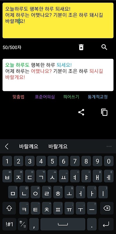 क्या आपको कोरियाई वर्तनी में कठिनाई होती है? अब आप अपने लेखन को और अधिक उत्तम बनाने के लिए हमारे ऐप का उपयोग कर सकते हैं। यदि आप ऐप में 500 अक्षरों तक का कोई वाक्य या शब्द दर्ज करते हैं, तो यह स्वचालित रूप से आपकी वर्तनी की जांच करेगा और सुधार का सुझाव देगा। इसके अतिरिक्त, संशोधित सामग्री को तुरंत कॉपी या साझा किया जा सकता है, जो बहुत सुविधाजनक है।