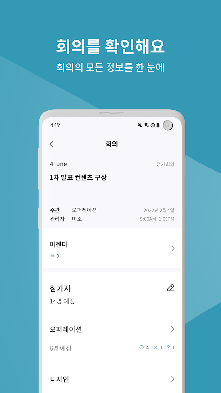 모두에게 명확한 회의. 회의 전에 정보를 숙지하고 본인의 상태를 공유할 수 있어요.