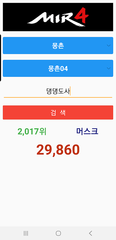 해당 서버 캐릭터명을 입력하여 랭킹 순위 및 전투력을 조회합니다.