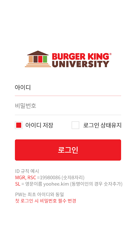 PC환경의 비케이알 버거킹유니버시티 (bkt.hunet.co.kr)의 아이디와 비밀번호로 로그인 가능하며,