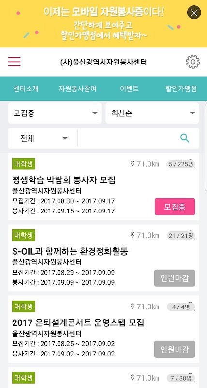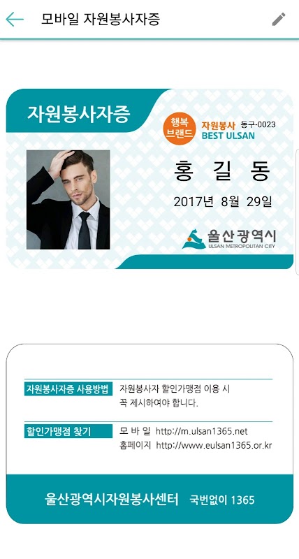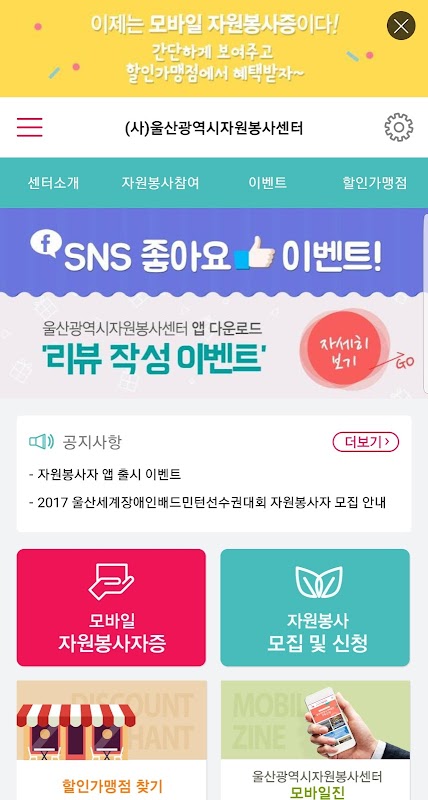 자원봉사 모집에 지원 신청 할 수 있고,내주변의 자원봉사, 활동처, 할인가맹점을 확인 할 수 있습니다.모바일 자원봉사자증 신청도 가능힙니다.