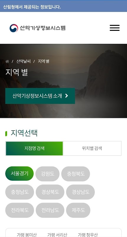 산림청에서 제공하는 산악 기상 정보를 나타냅니다.