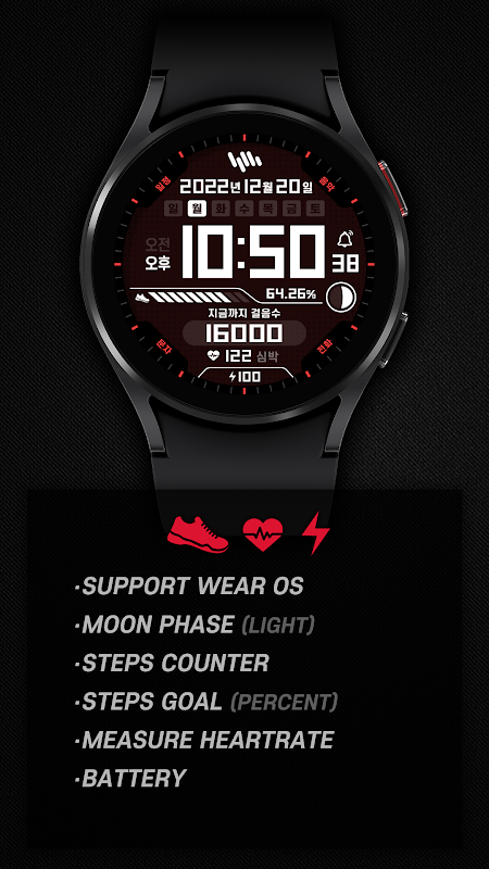 वॉचफेस में एक बैटरी, एक स्टैप काउंटर और एक हृदय गति माप है।