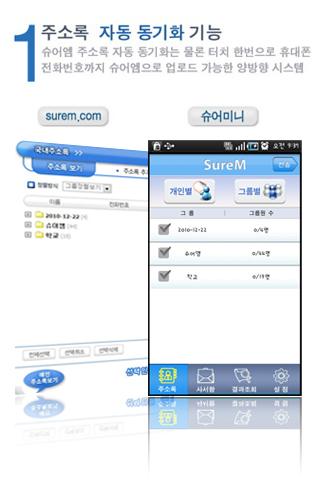 - 주소록 업로드 : 스마트폰에 저장된 주소록을 슈어엠 주소록에 저장하여 PC에서 손쉽게 관리 할 수 있습니다. (PC에서 엑셀파일 다운로드 기능 지원)