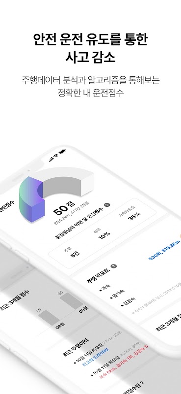 - कोरिया परिवहन सुरक्षा प्राधिकरण से जोखिम भरे ड्राइविंग व्यवहार अनुसंधान डेटा और वजन के आधार पर ड्राइविंग डेटा और ड्राइविंग प्रवृत्ति के विश्लेषण के माध्यम से प्रत्येक उपयोगकर्ता के लिए ड्राइविंग स्कोर प्रदान करता है।
