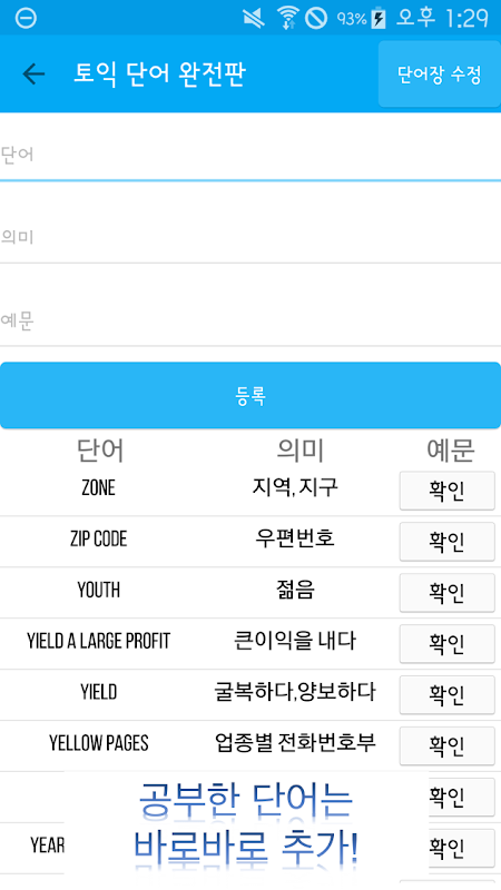편리하게 기본 단어장으로 학습하되 부족한 부분은 본인이 단어장내 단어 추가 기능으로 보충할 수 있습니다.