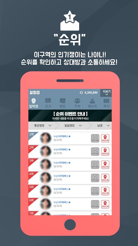 이성과 눈을 마주치기도 힘드신가요? 알파캠은 누구나 쉽게 대화 할 수 있도록 도와줍니다.맘에드는 이성에게 영상 신청만 하면 끝~ 간단하죠?