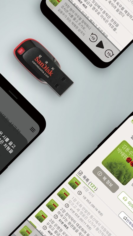 PC나 스마트폰에서 바로 연결되는 USB형 오디오북 전용 플레이어입니다. 복잡한 로그인도, 월정액 부담감도 없이 내가 원하는 책을 구매해서 원하는 디바이스에서 편하게 들어보세요.