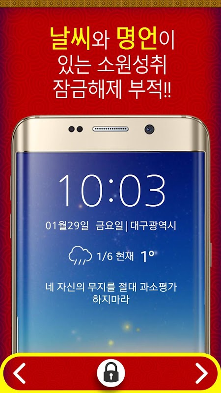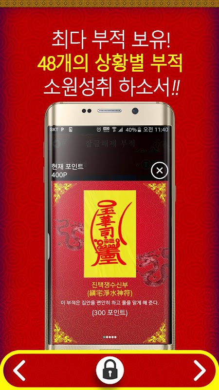 ▶ 잠금화면 아랫부분에 숨겨진 부적의 끝을 밀어올려 평안한 마음으로 부적의 의미를 되새깁니다.
