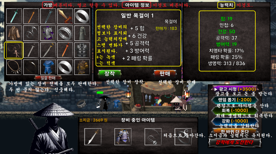When you defeat monsters, you get money and random items. Let's combine items to develop your own swordsman.