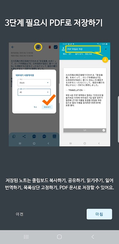 - 저장된 노트는 클립보드 복사하기, 공유하기, 읽어주기, 일본어 사전 검색, 목록상단 고정하기, PDF 문서로 저장할 수 있어요.