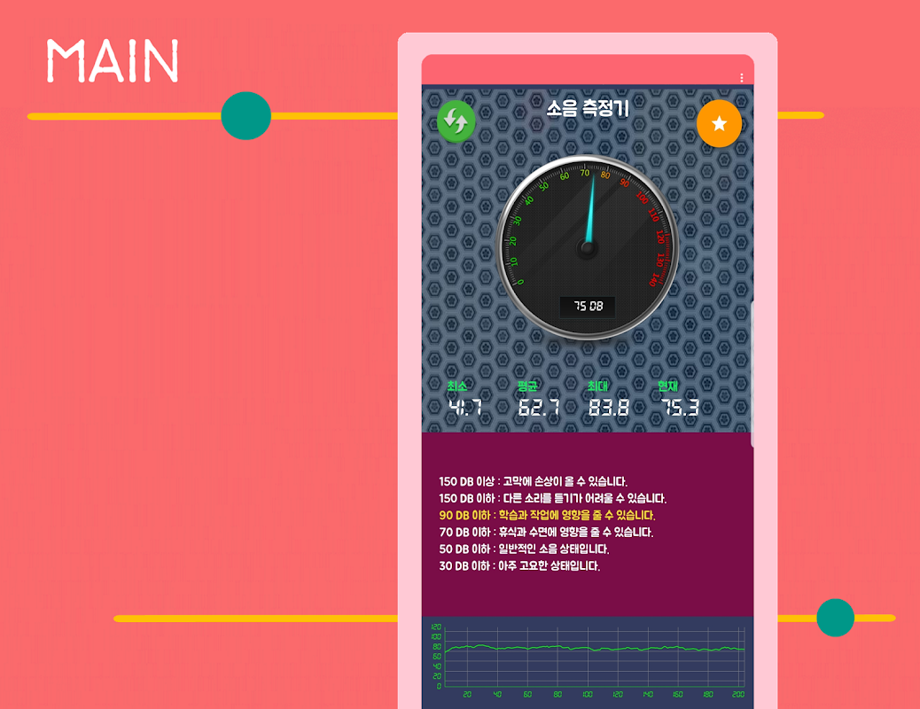 주변 소음을 측정하여 이를 데시벨로 변환하여 계기판과 그래프로 표시해주는 소음 측정기 입니다. 현재의 데시벨에 대한 설명도 함께 제공합니다.