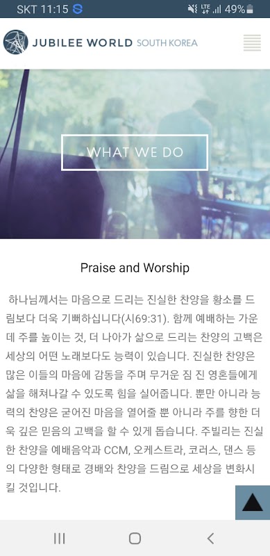 हमारा मिशन ओटीसीएस (ओलिवेट थियोलॉजिकल कॉलेज एंड सेमिनरी) के पूर्व छात्रों की एक छोटी सभा के रूप में शुरू किया गया था, जो ओयू (ओलिवेट यूनिवर्सिटी) के पूर्ववर्ती थे, जिनके पास प्रशंसा मंत्रालय के लिए एक दृष्टि थी। 2002 में, कोरिया में प्रेस्बिटेरियन चर्च के ओलिवेट असेंबली कोरिया के संगीतकारों ने 'जुबली मिशन' के नाम से अपनी गतिविधियाँ शुरू कीं। इस उम्मीद में कि अधिक प्रतिभाशाली सांस्कृतिक कार्यकर्ता हमारे साथ जुड़ेंगे, हमने अपने क्षेत्र का विस्तार एक अंतरजातीय समुदाय तक कर दिया है। सांस्कृतिक मिशन।