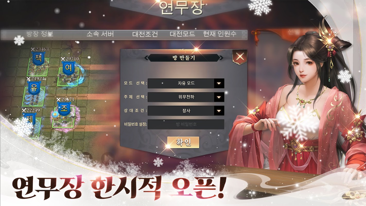다양한 컨텐츠를 통해 힘을 기를 수 있습니다. 주점에서 술을 이용하여 장수를 모집할 수 있으며, 과거 유비가 제갈량을 모시던 삼고초려의 방식보다 더 성의 있는 모집 방식이라 자부합니다!