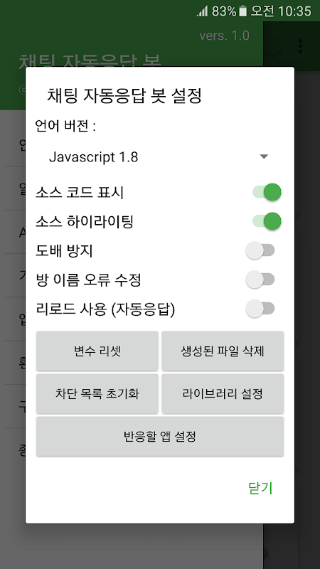 단순 자동응답 기능을 사용하거나, 자바스크립트 또는 커피스크립트, 루아, 라코스크립트라는 프로그래밍 언어를 이용하여 직접 프로그래밍을 하여 만들 수 도 있습니다. 상단바 오른쪽에 있는 점 3개가 있는 버튼(?)을 눌러서 봇 추가 등을 하실 수 있습니다.
