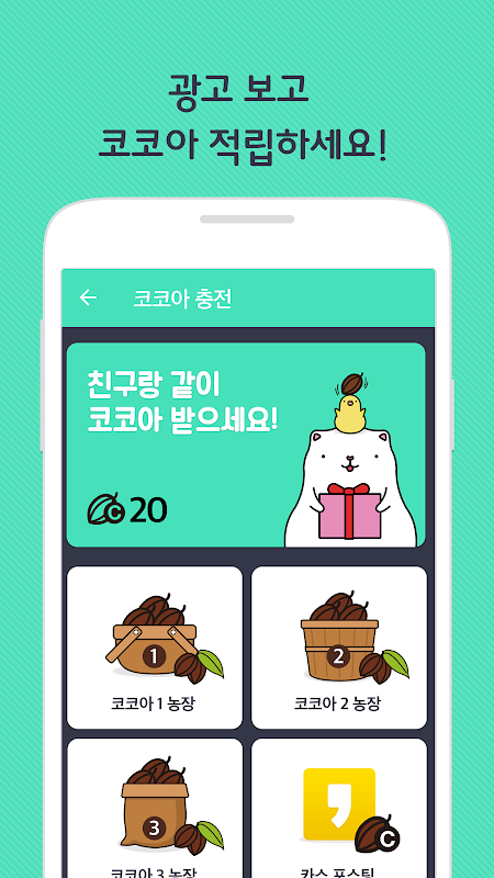 1. 친구초대 및 광고시청으로 코코아(포인트)가 적립됩니다!