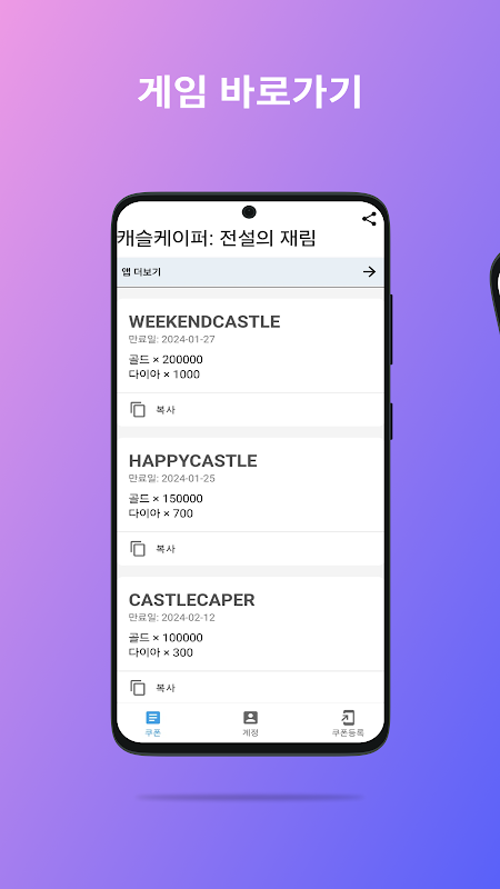 कूपन की समय सीमा समाप्त होने से पहले उसका उपयोग करें। आप "कैसल केपर" के लिए कूपन जानकारी प्रदर्शित कर सकते हैं और नए कूपन जारी होने पर पुश सूचनाएं प्राप्त कर सकते हैं।