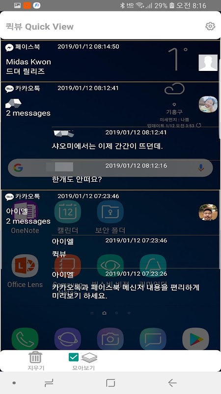 퀵뷰는 대기화면에서 카톡과 페이스북 메신저 내용을 '1'이 사라지지 않고 미리보기 할 수 있습니다.