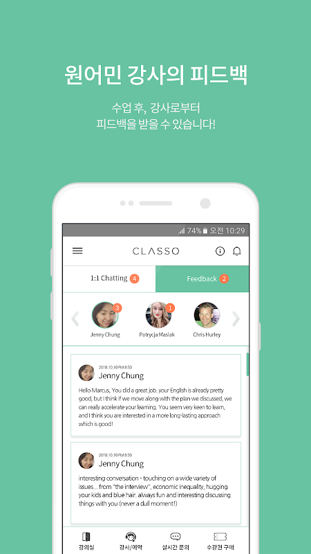 3. 강사와 채팅: 수업이 끝나도 관리는 계속된다! 영어회화 수업 후, 질문하고 피드백 받아보세요!
