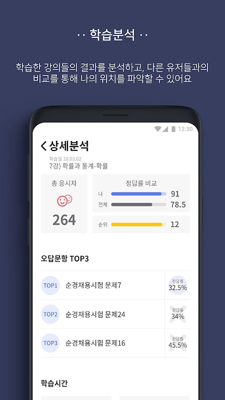 - 학습한 강의들의 결과를 분석하고, 다른 유저들과의 비교를 통해 나의 위치를 파악할 수 있답니다. 내가 틀린 문항에서 다른 유저들도 함께 틀렸는지, 나만 틀렸는지... 궁금하지 않으세요~?