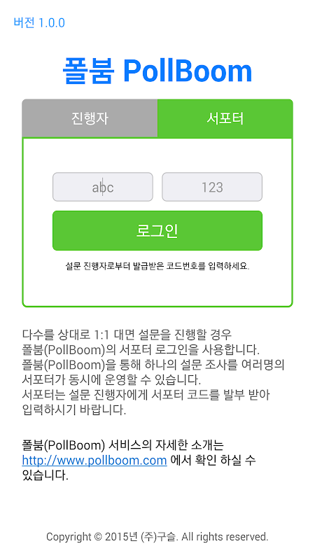 다수를 상대로 1:1 대면 설문을 진행할 경우 폴붐(PollBoom)의 서포터 로그인을 사용합니다.