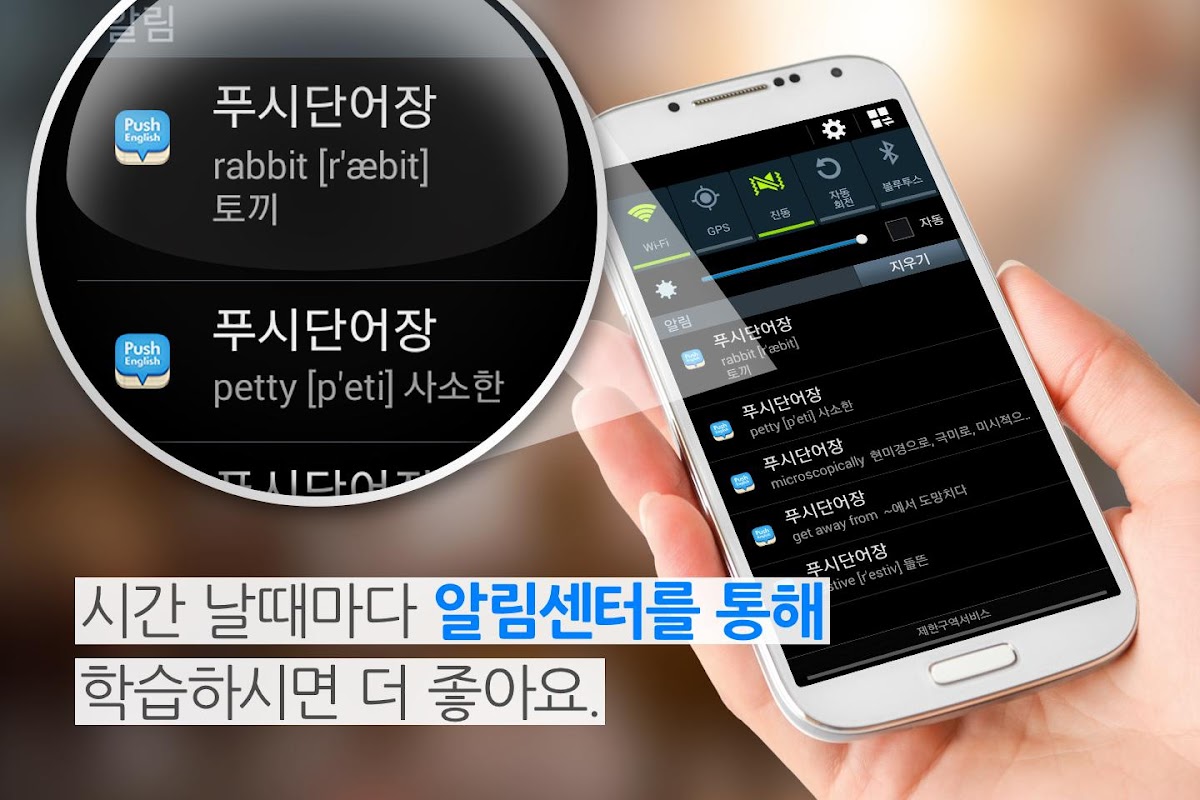 '푸시 단어장'은 단어, 뜻, 발음을 푸시로 보내주기 때문에 앱 실행 없이도 푸시창을 통해 틈틈이 단어를 암기할 수 있습니다.