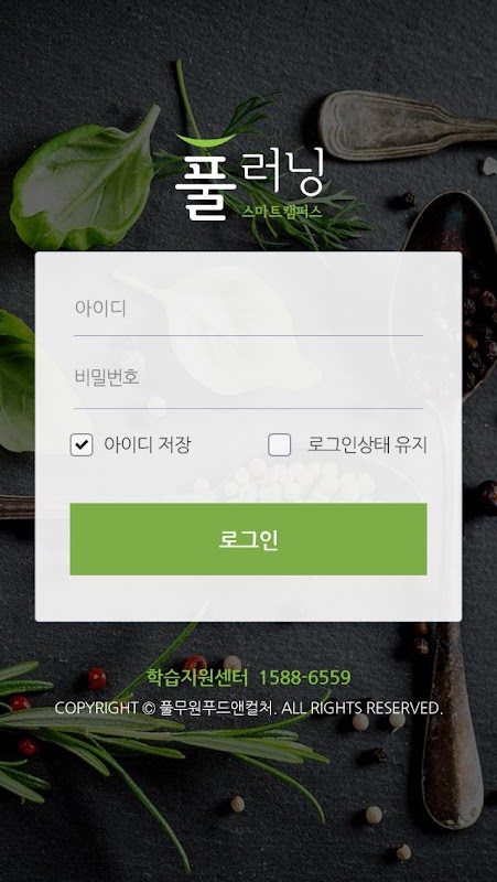 PC환경의 풀무원푸드앤컬처 스마트 캠퍼스 풀러닝아카데미(http://pulmuonefnc.hunet.co.kr)의 아이디와 비밀번호로 로그인 가능하며, 주요 서비스를 본 모바일 앱에서도 사용하실 수 있습니다.