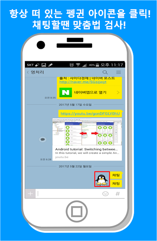 채팅, SNS할때 언제 어디서든 귀여운 펭귄 아이콘을 클릭시 바로 맞춤법 검사가 가능합니다.