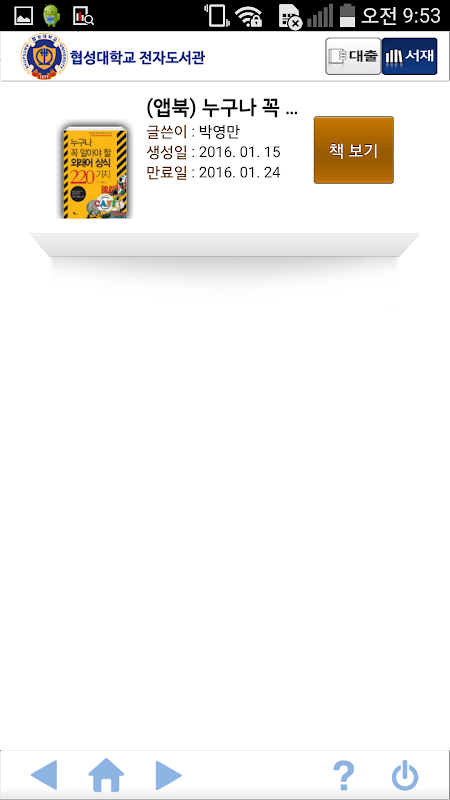 Hyupsung विश्वविद्यालय ई-लाइब्रेरी ऋण एक किताब ई सेवा, लक्ष्य से प्रयोक्ता प्रमाणीकरण के साथ सदस्यों को उपलब्ध कराने के लिए। Ebooks, ऋण और एक स्मार्टफोन के माध्यम से खोज कभी भी, कहीं भी पढ़ने के लिए संभव है।