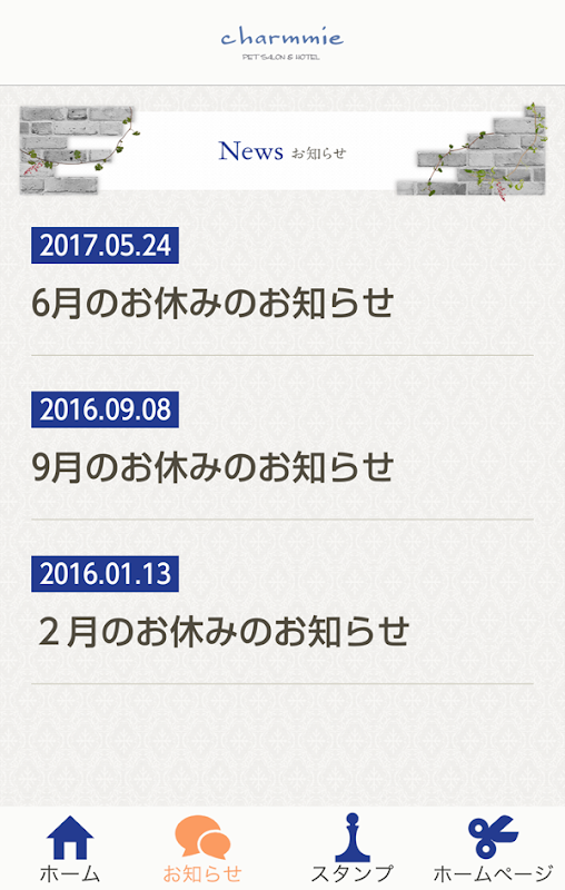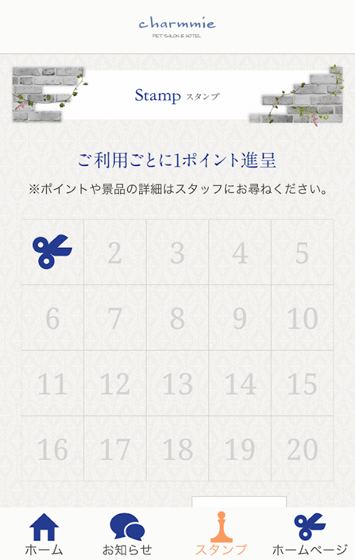 このアプリでは、【charmmie(チャーミー)】の最新の情報をいち早くお届けし、ご利用することでポイントが貯まるスタンプ機能や、ホームぺージをすぐご確認頂け、ボタン1つでお電話が可能です。